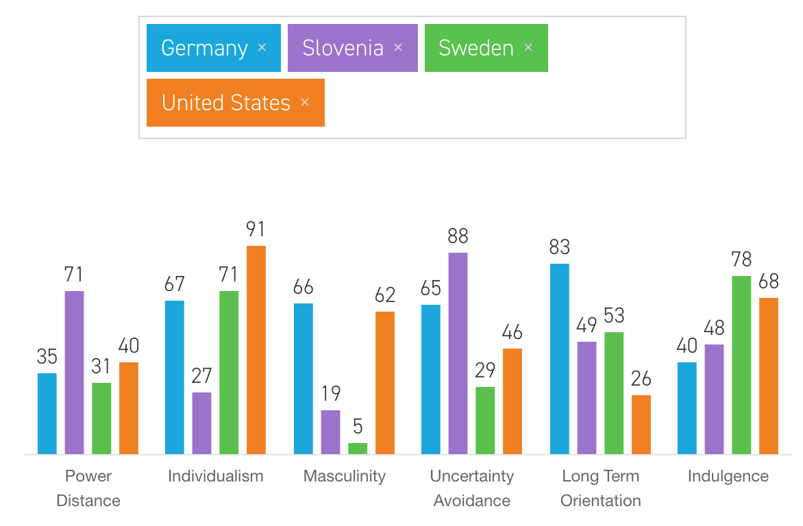Long-term orientation scores, meanwhile, show the opposite results. The United States, with its significantly lower scores than Germany, Slovenia and Sweden, is a more normative society where people, according to Hofstede Insights, “prefer to maintain time-honoured traditions and norms while viewing societal change with suspicion.” This contrasts with more pragmatic societies that have a higher score; these countries “encourage thrift and efforts in modern education as a way to prepare for the future.” It’s certainly an ironic conclusion for the United States, given that it’s more typically known for its entrepreneurial push for change.